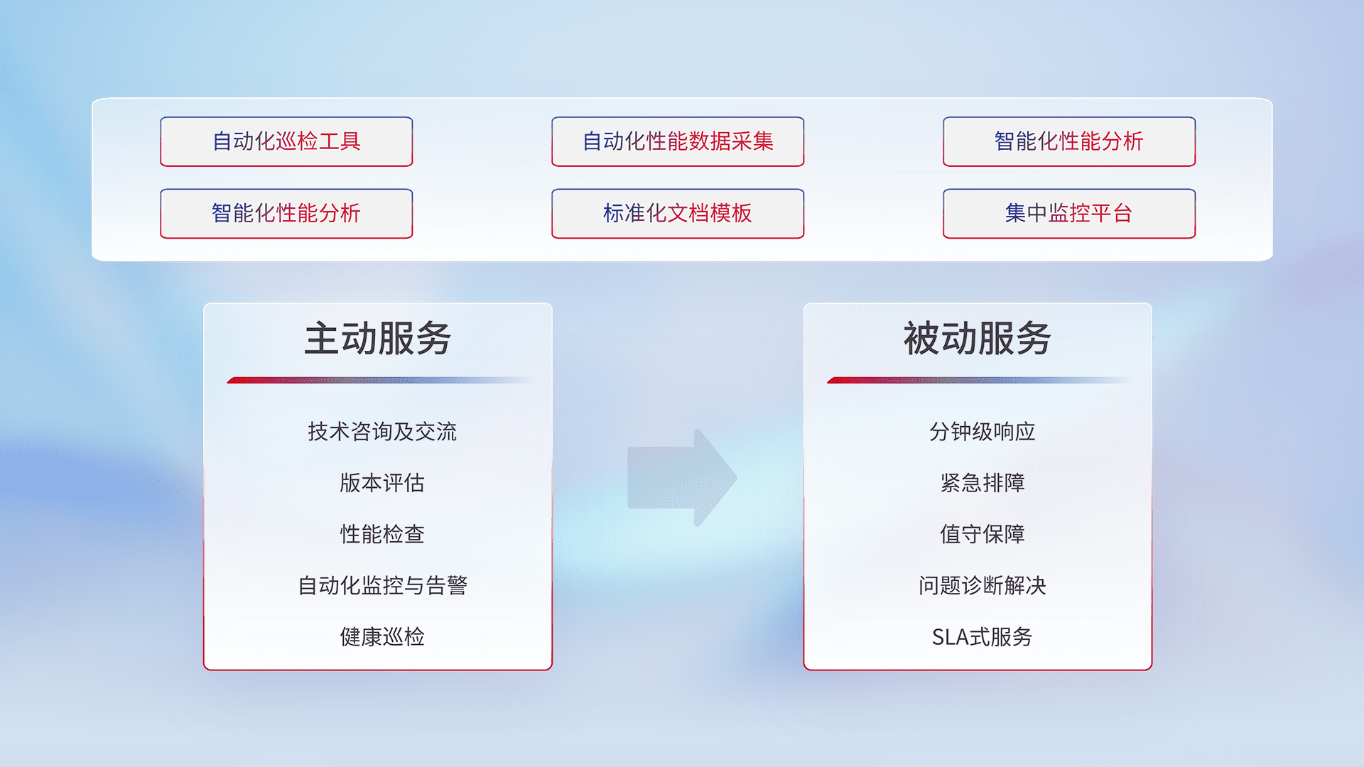 智能化工具和标准化文档,,保障服务质量,,提供主动服务(包含技术咨询、、、、版本评估、、、性能检查、、自动化监控与告警、、健康巡检)和被动服务包含(分钟级响应、、、、紧急排障、、、值守保障、、问题诊断解决、、SLA服务)。。